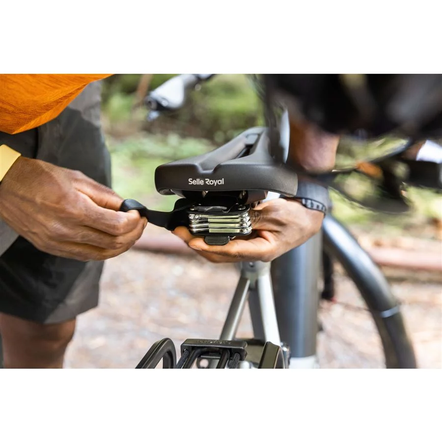 Buďte vždy pripravení na nečakané situácie. Kompaktné 9-funkčné multifunkčné náradie sa upevňuje na zadnú časť sedla vybaveného systémom ICS a je vždy po ruke pre rýchle úpravy či opravy. Náradie je chránené odolným gumovým puzdrom proti nárazom.